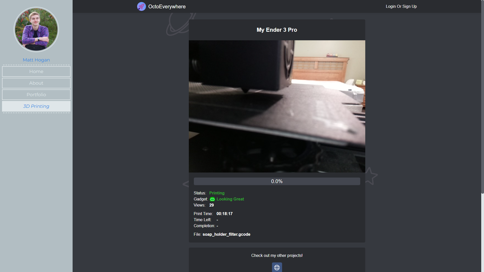 Hey there! Today, I'm super happy to bring back a hobby of mine through the use of both a Raspberry Pi 3 mini-computer and my new portfolio website. Thanks to the OctoPi software and a few third-party plugins, I can now share my prints both during and after their completion. In time, I'll have a small collection of time lapse videos and plan to make a nice little gallery for them, but until then I hope you enjoy the livestreaming feature that's all ready to go!