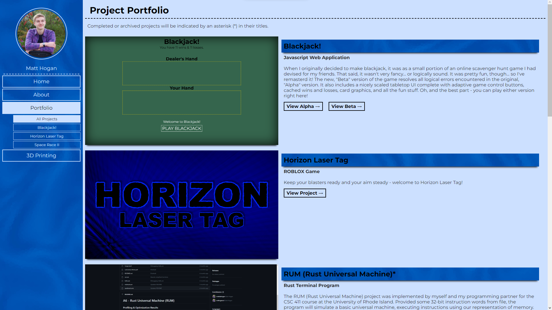 Over time, I have been slowly giving this portfolio page the makeover that it was due for. Recently, that has included fundamentally reworking the navigation menu system to be... well, an actual system rather than hard-coded per-page. It's also included revisiting old projects. I find that it can become difficult to keep track of one's own projects when actively engaged in learning new computer science concepts and implementing them for classes. That said, I hope to get back to working on independent projects, such as Blackjack, which just received quite the update. Feel free to check it out and let me know what you think!